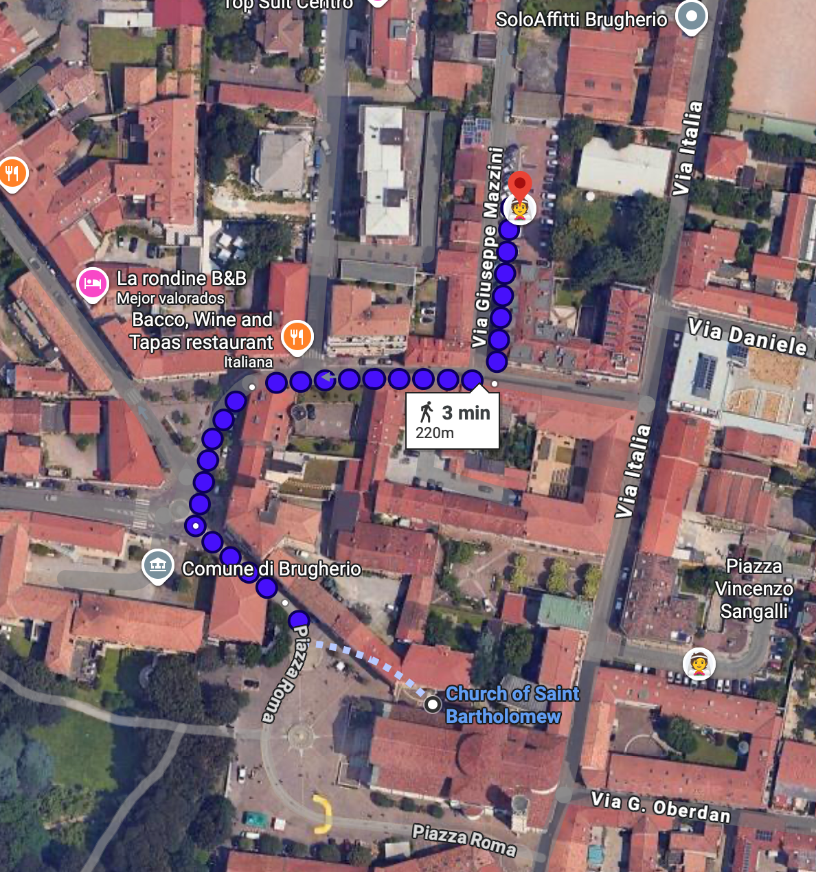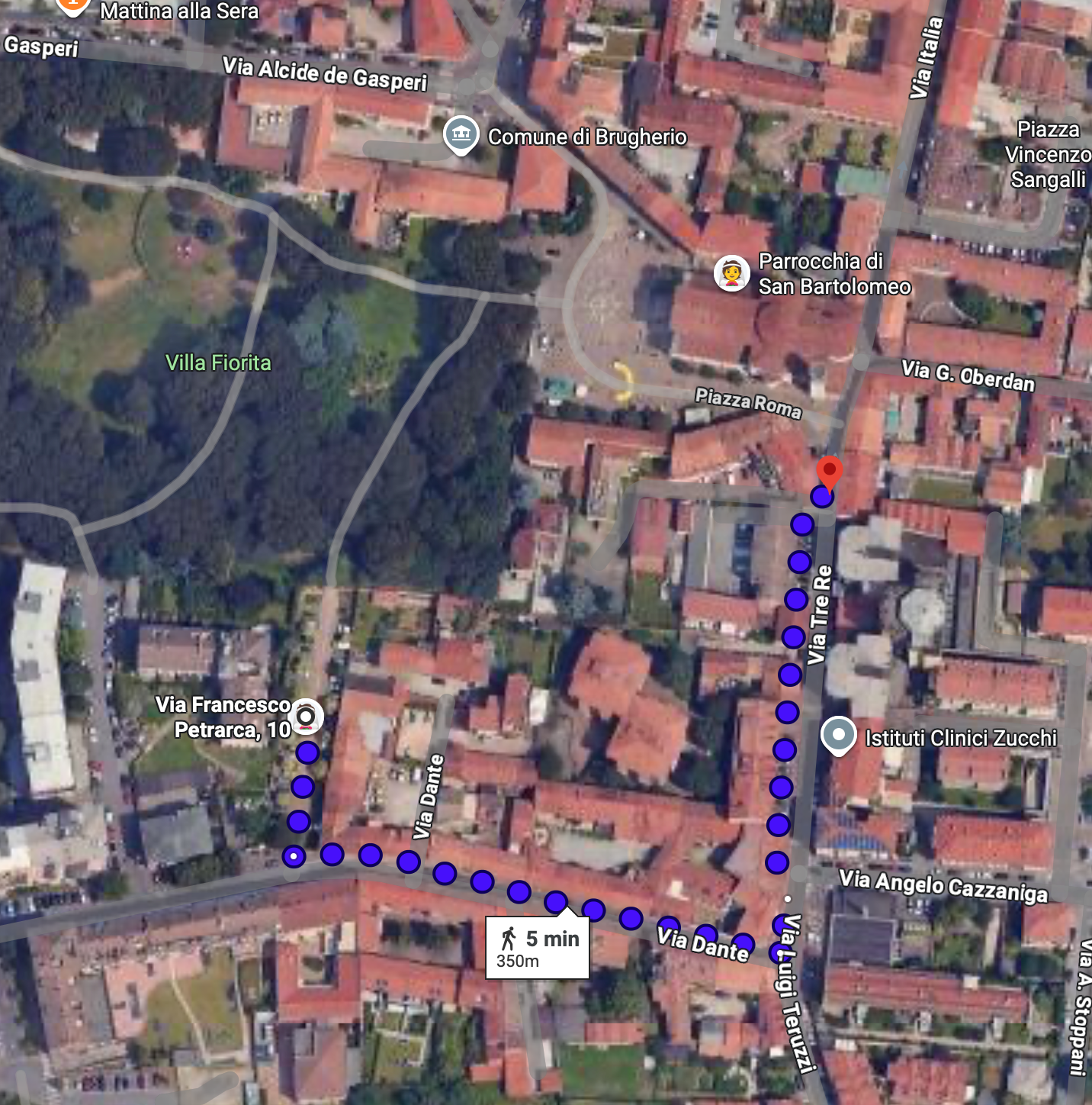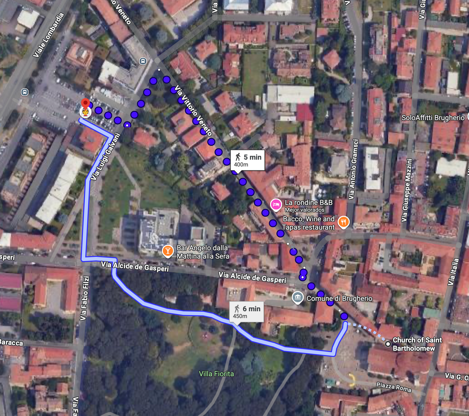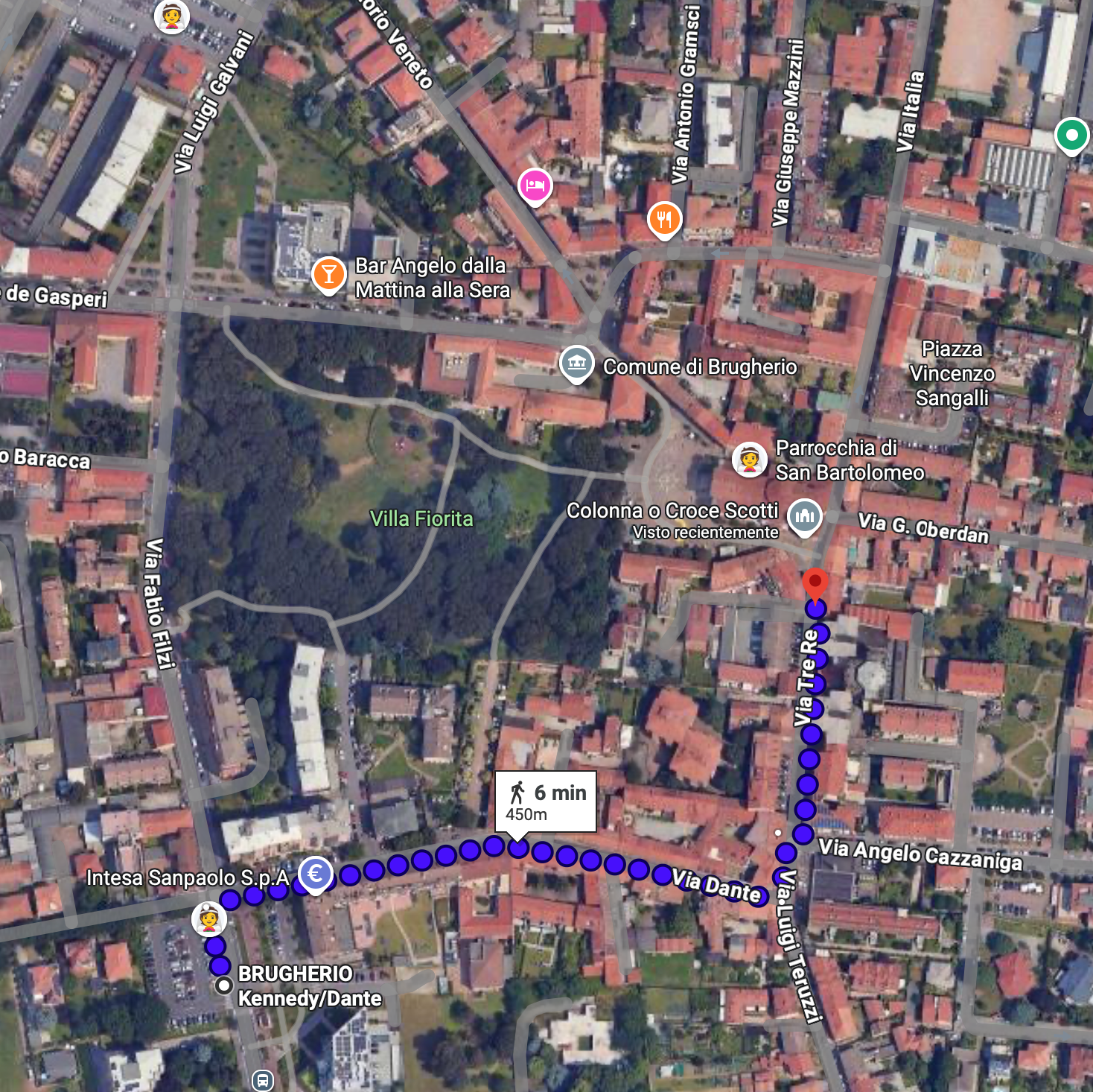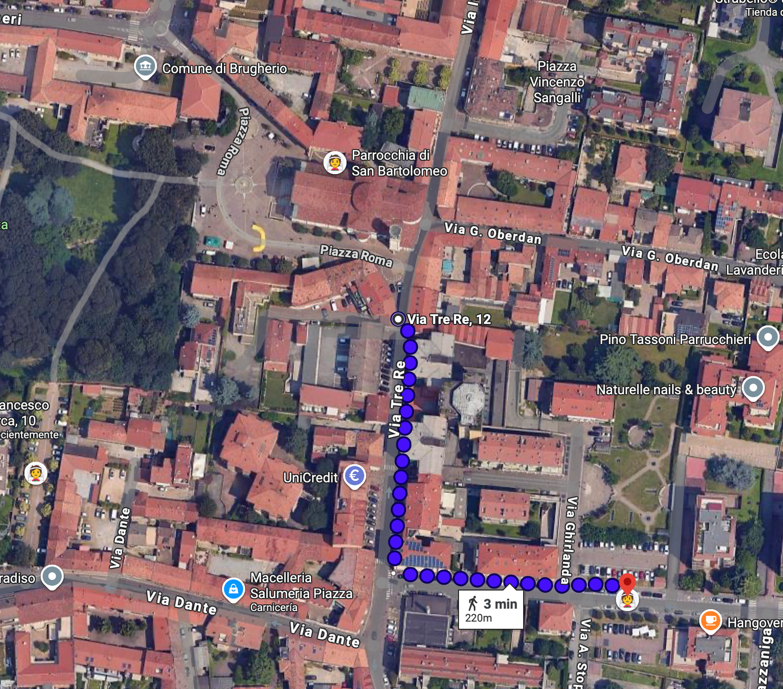 Otra opción de aparcamiento es Via Dante, en el ángulo con Via Foscolo, situada a unos 9 minutos a pie de la iglesia. Desde allí, el recorrido más sencillo es seguir por Via Dante y continuar por Via Tre Re hasta llegar a la Iglesia.