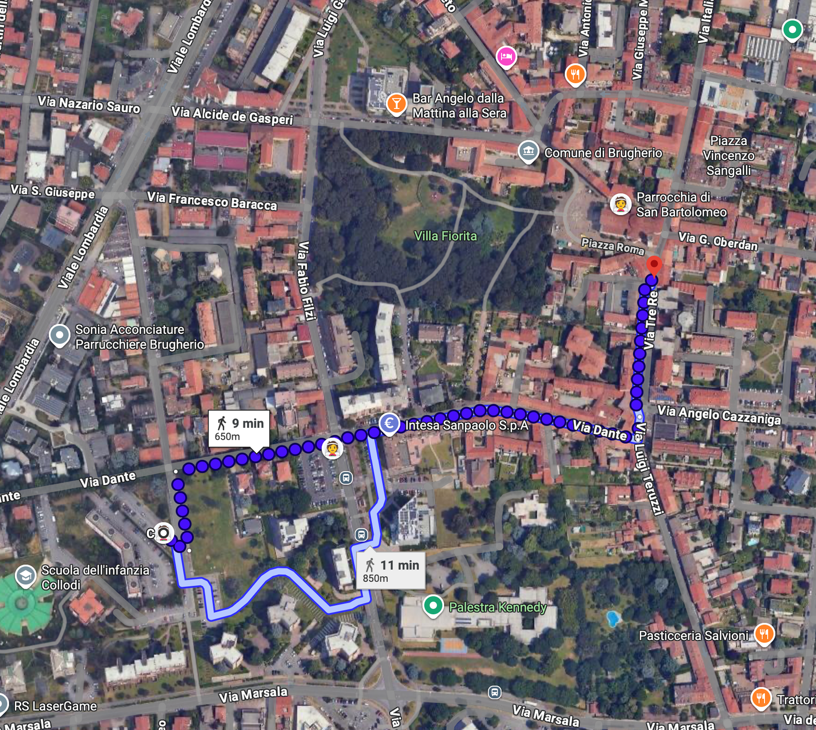 También podéis aparcar en la esquina de Via Kennedy con Via Dante, a unos 7 minutos a pie de la iglesia. Desde allí, el recorrido más cómodo es seguir por Via Dante y continuar por Via Tre Re hasta llegar. Aunque pueda parecer tentador atajar atravesando el parque, no lo recomendamos.